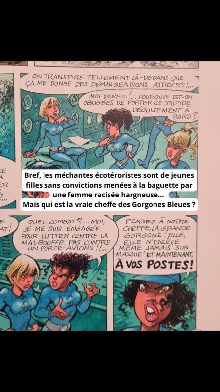evidement c'est pas un livre pour enfants d'ailleurs il a été annoncé comme tel hors cadre des spirou habituelle, il y a de la satire a toute les pages des critiques de notre société de consommation de fakenews de like sur le réseaux sociaux, de cancel culture, dany dessine les femmes plantureuse comme a son habitude mais c'est sur l'équipage noir du porte avion est caricaturé , grosse lèvre, idiot pret a tiré sur tout ce qui bouge caricature des americain toujours pret a faire la guerre etc , alors que hors du navire ils sont dessiné "normalement" la masseuse asiatique du personnage donald trump Simon Santo dit SS ( Simon Santo dérivé de monsanto et SS ba les nazi quoi ) est jaune fluo tout absolument tout dans cette bd est une satire