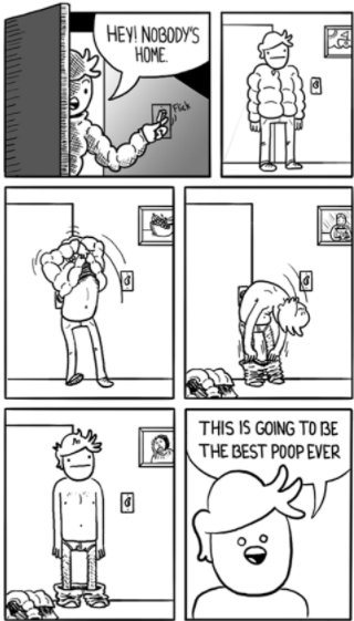 Le caca, trop vrai, on dirait mon fils qui rentre de l'école et court aux chiottes.